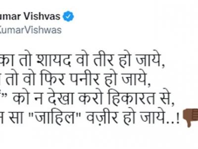 कुमार विश्वास ने सिराजुद्दीन हक्कानी के अफगानिस्तान के गृहमंत्री बनाए जाने की एक खबर को रीट्वीट करते हुए यह बात कही। कुमार विश्वास ने ट्वीट किया- लगे जो तुक्का तो शायद वो तीर हो जाये, फटे जो दूध तो वो फिर पनीर हो जाये, “आतंकियों” को न देखा करो हिकारत से, न जाने कौन सा "जाहिल" वज़ीर हो जाए..!