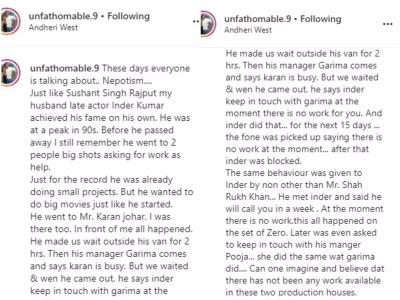 पल्लवी सर्राफ ने सोशल मीडिया पर लिखा, 'इन दिनों हर कोई नेपोटिजम पर बात कर रहा है। सुशांत सिंह राजपूत की तरह मेरे पति ने अपने दम पर फेम पाया था। वह 90 के दशक में पीक पर थे। उनके गुजरने से पहले मुझे याद है कि वह दो लोगों के पास काम के लिए गए थे। वह करण जौहर के पास गए थे, वहां मैं भी थी। सबकुछ मेरे सामने हुआ था। उन्होंने अपनी वैन के बाहर हमें 2 घंटे इंतजार कराया। इसके बाद उनकी मैनेजर गरिमा ने कहा कि करण जौहर बिजी हैं। इसके बाद वह लगातार 15 दिन तक करण के ऑफिस के चक्कर लगाते रहे, लेकिन कोई काम नहीं मिला।