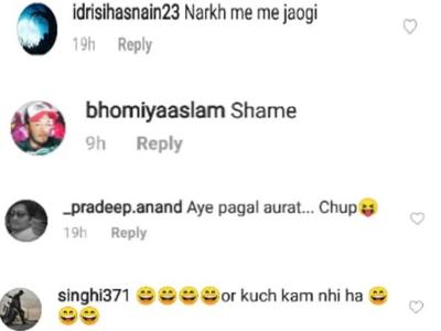 एक यूजर ने मंदना की फोटो पर कमेंट किया और लिखा कि वो नर्क में जाएंगी। तो एक अन्य यूजर ने लिखा कि ये फोटो शेयर करने पर उन्हें शर्म आनी चाहिए। इससे पहले पिछले महीने भी मंदना ने अपनी इस फोटोशूट की एक तस्वीर पोस्ट की थी, जिसपर लोगों ने भद्दे कमेंट्स किए थे। एक्ट्रेस इस तरह के कमेंट की परवाह कम करती हैं और अपनी ग्लैमरस फोटो शेयर करती रहती हैं।