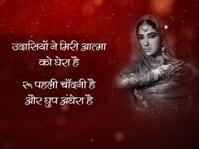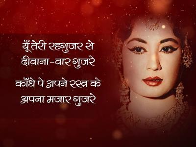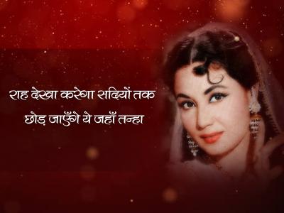 मीना कुमारी न केवल महान अभिनेत्री थीं बल्कि एक काबिल शायरा भी थीं। मीना कुमारी की मृत्यु के बाद गुलज़ार के संपादन में उनकी शायरी की किताब प्रकाशित हुई थी। मीना कुमारी की पुण्यतिथि 31 मार्च को पढ़िए उनके चुनिंदा शेर।