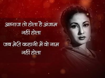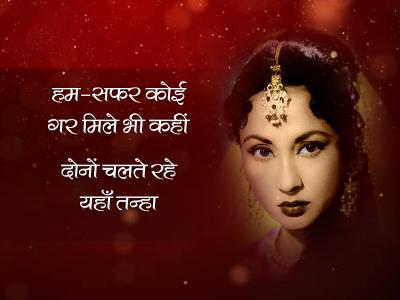 मीना कुमारी ने मरने के बाद अपनी डायरी का पूरा अख्तियार गुलजार को सौंपा था। गुलजार ने ही मीना कुमारी के देहांत के बाद उनकी शायरी को किताब के तौर पर प्रकाशित कराया था। आज मीना कुमारी की पुण्यतिथि पर पढ़िए उनके कुछ चुनिंदा शेर-