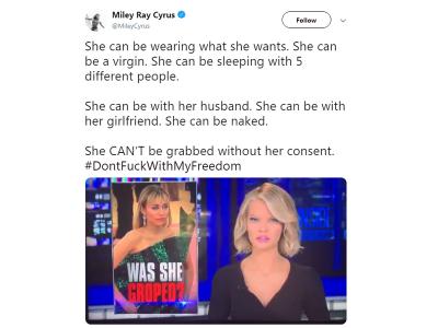 ट्वीट में माइली ने लिखा है वह जो चाहे पहन सकती है। वह वर्जिन हो सकती है। वह पांच अलग-अलग लोगों के साथ सो सकती है। वह अपने हसबैंड के साथ हो सकती है। वह अपने गर्लफ्रेंड के साथ रह सकती है। वह नग्न रह सकती है। उसकी सहमति के बिना उसे नहीं पकड़ा जा सकता।