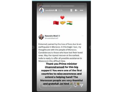 नोरा ने अपनी इंस्टाग्राम स्टोरी पर पीएम की पोस्ट को दोबारा शेयर किया। इसके साथ उन्होंने लिखा, "इस बड़े समर्थन के लिए प्रधानमंत्री नरेंद्र मोदी को धन्यवाद! आप जागरूकता बढ़ाने और मदद के लिए हाथ बढ़ाने वाले पहले देशों में से एक थे! मोरक्को के लोग बहुत आभारी और आभारी हैं! जय हिंद।"