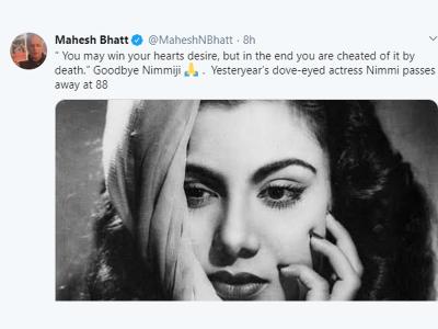 आप अपने दिल को भले ही इच्छा से जीत सकते हैं, लेकिन आखिरी में आप मौत से धोखा खा जाते हैं। हाथ जोड़कर अलविदा निम्मी जी। महेश भट्ट के अलावा निम्मी के निधन को लेकर बॉलीवुड के दिग्गज एक्टर ऋषि कपूर ने भी ट्वीट किया, जिसने सबका खूब ध्यान खींचा है।