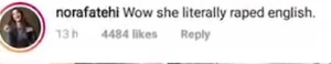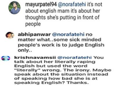 वायरल वीडियो पर नोरा ने लड़कियों के सपोट की जगह लिथा है कि "वाह,,,उसने तो वाकई इंग्लिश का रेप कर दिया।" बस फिर क्या था वह यूजर्स के हत्थे चढ़ गईं और जमकर ट्रोल गईं।
