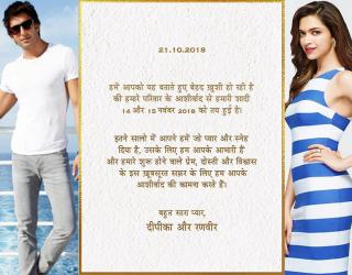 बॉलीवुड चुस्की : रणवीर सिंह और दीपिका पादुकोण ने अपनी शादी का कार्ड सोशल मीडिया पर किया पोस्ट