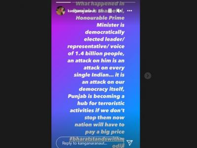 कंगना ने इंस्टा स्टोरी में आगे लिखा, पीएम पर अटैक हर भारतीय पर अटैक है... यह हमारे लोकतंत्र पर भी अटैक है, पंजाब आतंकी गतिविधियों का हब बनता जा रहा है अगर हमने उनको अब नहीं रोका तो राष्ट्र को इसकी बड़ी कीमत चुकानी पड़ेगी।