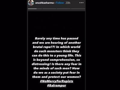 अनुष्का शर्मा ने अपनी इंस्टा स्टोरी पर लिखा था, कुछ ही वक्त बीता औ हमें एक और वीभत्स रेप के बारे में पता चला। किस दुनिया में ये राक्षस किसी यंग लाइफ के साथ ऐसा करने का सोच सकते हैं।
