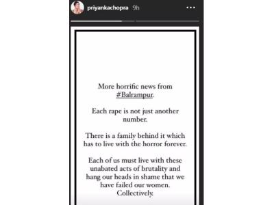प्रियंका चोपड़ा ने इंस्टाग्राम पर लिखा है, बलरामपुर से और डरावनी खबर आई है। हर रेप सिर्फ एक और नंबर नहीं होता। इसके पीछे एक परिवार होता है जिसे इस डर के साथ हमेशा रहना होता है। उन्होंने लिखा, हम सबको इन भयावह कृत्यों के लिए शरम से अपना सिर झुका लेना चाहिए कि हम अपनी महिलाओं के लिए कुछ नहीं कर सके।