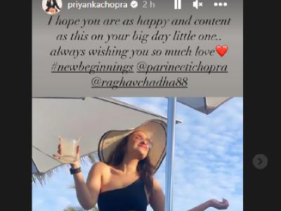 अपने इस्टाग्राम पर प्रियंका ने परिणीति की फोटो शेयर करते हुए उन्हें शादी की बधाई दी। इंस्टाग्राम स्टोरीज पर प्रियंका ने परिणीति चोपड़ा की एक पुरानी तस्वीर साझा की, जिसमें वह बाहर पेय का आनंद ले रही हैं। उसने काला टॉप, बहुरंगी स्कर्ट और टोपी पहनी थी। परिणीति ने मुस्कुराते हुए अपनी आंखें बंद कर लीं।
