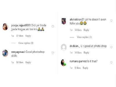 उनकी फोटो पर कमेंट करते हुए लिखा "दीदी यह थोड़ा ज्यादा हो गया, अब बस करो। वहीं, दूसरे यूजर ने इस फोटो पर रिएक्शन देते हुए लिखा, "अच्छी फोटोशॉप स्किल है। इस तरह से यूजर्स ने तरह तरह के कमेंट राखी की इस फोटो पर किए हैं।