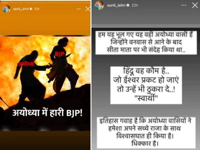 Faizabad Election 2024 Result: उत्तर प्रदेश के फैजाबाद सीट जिसके अंदर अयोध्या आती है वहां बीजेपी की हार के बाद से मुद्दा गरमाया हुआ है। सोशल मीडिया पर अयोध्या की जनता की बीजेपी समर्थक जमकर आलोचना कर रहे हैं। इसी कड़ी में टेलीविजन हस्ती रामायण फेम सुनील लहरी ने अयोध्या की जनता की जमकर आलोचना की है। सुनील लहरी ने सोशल मीडिया के जरिए अपनी नाराजगी जताई और बीजेपी के हारने पर जनता को कोसा। इंस्टाग्राम स्टोरीज में सुनील लहरी ने अयोध्या के लोगों को "स्वार्थी" कहा और उन पर "अपने राजा को धोखा देने" का आरोप लगाया। उन्होंने लिखा, "हम भूल गए कि ये वही अयोध्या के नागरिक हैं जिन्होंने वनवास से लौटने के बाद देवी सीता पर संदेह किया था। आप उस व्यक्ति को क्या कहेंगे जो भगवान को भी नकार देता है? स्वार्थी। इतिहास गवाह है कि अयोध्या के नागरिकों ने हमेशा अपने राजा को धोखा दिया है। शर्म आनी चाहिए उन पर।"