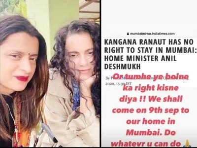 इसके बाद कंगना को लेकर महाराष्ट्र के गृहमंत्री अनिल देशमुख ने भी कहा कि अगर वह मुबई के बारे में ऐसी टिप्पणी करती हैं तो उन्हें महाराष्ट्र या मुंबई में नहीं रहना चाहिए। गृहमंत्री अनिल देशमुख के इस बयान पर रंगोली चंदेल ने अपने इंस्टाग्राम अकाउंट की स्टोरी पर लिखा है, 'और तुम्हें यह कहने का अधिकार किसने दिया ? हम नौ सितंबर को अपने घर मुंबई आएंगे, आपसे जो होता हो कर लो।'