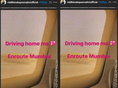रिद्धिमा अपनी कार से ही दिल्ली से मुंबई के लिए रवाना हुई हैं। उन्होंने अपनी इंस्टास्टोरी पर एक वीडियो शेयर किया है जिसमें उनकी कार की खिड़की नज़र आ रही है और खाल रास्ता दिख रहा है। वीडियो शेयर करते हुए रिद्धिमा ने लिखा, ‘घर आ रही हूं मां’।