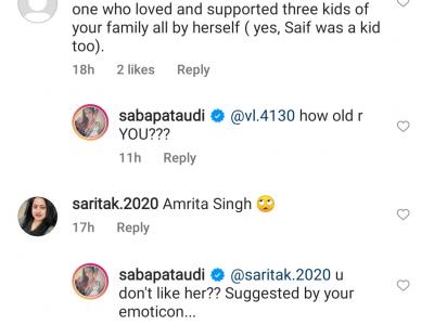 हालांकि, सबा अली खान ने ट्रोलर्स की बोलती बंद कर दी। उनसे एक यूजर ने कमेंट कर पूछा था कि "अमृता जी कहां हैं?" इसके जवाब में सबा ने कहा "मुझे लगता है कि वो घर पर आराम से सो रही होंगी।" इसके अलावा एक अन्य यूजर ने कमेंट कर पूछा "सबसे मजबूत गायब है, वह जो आपके परिवार के तीन बच्चों (हां सैफ भी एक बच्चे थे) को खुद से संभालती व प्यार करती थीं और उनका समर्थन करती थीं। इसपर सबा ने जवाब देते हुए लिखा "आपकी उम्र क्या है?"