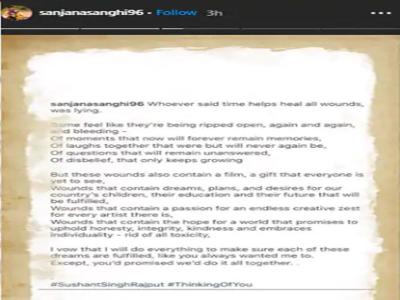 एक्ट्रेस संजना सांघी ने इंस्टाग्राम पर एक नोट शेयर किया है। इस नोट में उन्होंने लिखा, 'सुशांत और मैंने मिलकर कुछ ड्रीम्स देखे थे, जिसे पूरा करने की मेरी कोशिश रहेगी। इन जख्मों के साथ सुशांत फिल्म के रूप में एक गिफ्ट देकर गए हैं, जो अभी सबको देखना है। कुछ अनसुलझे सवालों के जख्म हमेशा बने रहेंगे और अविश्वाश जो बढ़ता जाएग। देश के बच्चों के लिए प्लान, उनके भविष्य और उनकी शिक्षा के लिए सुशांत ने जो सपने देखे थे, उन्हें पूरा करने की कोशिश रहेगी।'
