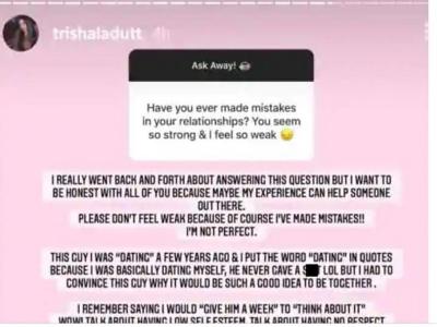 संजय दत्त की बेटी त्रिशला ने हाल ही में सोशल मीडिया पर 'आस्क मी एनिथिंग' सेशन के अंतर्गत फैंस के साथ बातचीत की। अमेरिका के न्यूयॉर्क में पली-पढ़ी और वहीं पर साइकोथेरपिस्ट के रूप में काम कर रही त्रिशला ने अपने रिलेशनशिप के दौरान झेलीं मुश्किलों पर भी खुलकर बात की।