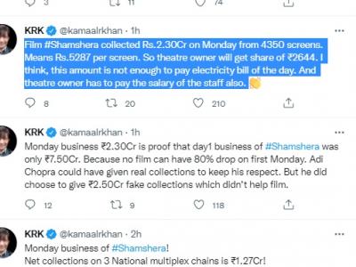 केआरके ने शमशेरा के बॉक्स ऑफिस कलेक्शन के आंकड़े साझा करते हुए कहा, फिल्म शमशेरा ने सोमवार को 4350 स्क्रीन्स से 2.30 करोड़ रुपये बटोरे। मतलब 5287 रुपये प्रति स्क्रीन। तो थिएटर मालिक को ₹2644 का हिस्सा मिलेगा। मुझे लगता है, इस राशि से एक दिन के बिजली बिल का भुगतान भी नहीं हो सकता। थिएटर मालिक को स्टाफ का वेतन भी देना पड़ता है।