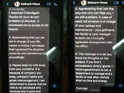दूसरे मैसेज में उन्होंने लिखा, ''कृपया मेरी पत्नी को अपनी समस्याओं से दूर रखो। ये सब तुम्हारी संगत, खराब आदतों और मिसमैनेजमेंट की वजह से हो रहा है। मेरी पत्नी बहुत अच्छी है और मैं ये सुनिश्चित करना चाहता हूं कि वो बेवजह परेशान न हों। इस वक्त अगर कोई तुम्हारी मदद कर सकता है तो वो मैं हूं और मैं अवेलेबल हूं। अगर जरूरत लगे तो जो भी तुम्हारा इन-चार्ज हो, तुम्हारी गर्लफ्रेंड, उसका परिवार या तुम्हारे मैनेजर, उनसे कहना कि मेरे ऑफिस से बात करके आपसी सहमति से कोई व्यवस्था तय करें। मैसेज भेजने का मेरा मकसद इस मुद्दे पर अपने विचार रखने का था। अगर तुम्हें ये गैरजरूरी लगता है तो इग्नोर कर देना।