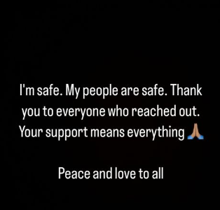 एक इंस्टाग्राम पोस्ट में गायक ने लिखा, "मैं सुरक्षित हूं। मेरे लोग सुरक्षित हैं। मदद करने वाले सभी लोगों को धन्यवाद। आपके समर्थन का मतलब सब कुछ है। सभी को शांति और प्यार।"