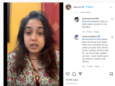 इरा खान के इस पोस्ट का समर्थन मशहूर सिंगर सोना महापात्रा ने भी किया है। उन्होंने इरा के पोस्ट पर कमेंट करते हुए लिखा था 'गुड़िया डॉली।' हालांकि, सिंगर को अपने इस कमेंट की वजह से ट्रोल होना पड़ा, लेकिन उन्होंने ट्रोलर को जमकर लताड़ लगाई। बताते चलें कि एक ट्रोलर ने सोना के कमेंट पर रिप्लाई देते हुए लिखा कि आपको ये डॉली कहां से दिख रही है बेवकूफ? वहीं, इसके जवाब में सोना महापात्रा ने लिखा, "जाहिर सी बात है आपके पास कुछ काम नहीं है, आप परेशान होकर यहां पर अपनी लूजर लाइफ का जहर फैला रहे हो। जाओ कुछ काम सीखो और करो। लूजर बनकर अपने मां-बाप को नीचा मत दिखाओ।"