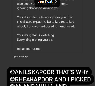 उन्होंने आगे लिखा, "आपकी बेटी देखती है जब आप अपनी पत्नी की बात सुनते हैं (या नहीं), जब वह बात कर रही होती है। वह यह भी देखती है कि आप अपने फोन को घूर रहे हैं, अपने आसपास की दुनिया को नजरअंदाज कर रहे हैं। आपकी बेटी आपसे सीख रही है कि कैसे उससे बात की जाए, बात की जाए, सम्मान दिया जाए और देखभाल की जाए और प्यार किया जाए। आपकी बेटी आपके हर एक काम को देख रही है। अपना खेल बढ़ाएं।"