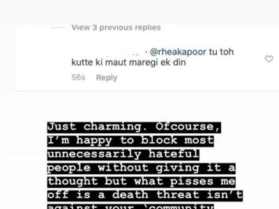 इसके साथ ही सोनम ने कमेंट का एक स्क्रीनशॉट भी शेयर किया है, जिसमें रिया के लिए लिखा है : तू तो कुत्ते की मौत मरेगी एक दिन।'' बता दें कि इन दिनों सोनम कपूर को स्टार किड होने के कारण यूजर्स सोशल मीडिया पर ट्रोल कर रहे थे। ट्रोलर्स से परेशान सोनम ने कुछ दिन पहले ही अपने इंस्टाग्राम अकाउंट पर कमेंट सेक्शन ऑफ कर दिया था।