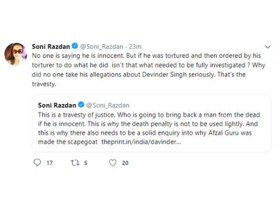 सोनी राजदान ने ट्वीट कर लिखा, "ये न्याय का मजाक है. कौन उस मरे हुए इंसान को वापस लाएगा अगर बाद में ये पता चलता कि वो निर्दोष था। इसीलिए कभी भी मौत की सजा को हल्के में नहीं लिया जाना चाहिए। और इसीलिए इस मामले में सॉलिड जांच की जानी चाहिए कि अफजल गुरु को बलि का बकरा क्यों बनाया गया था।
