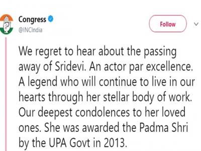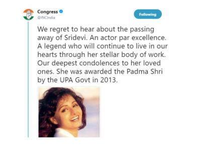 श्रीदेवी के निधन पर कांग्रेस ने किया ऐसा ट्वीट, लोगों ने कहा- मत करो मौत पर राजनीति
