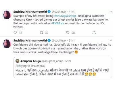 इसके बाद उन्होंने ट्वीट में लिखा कि मेरे पिछले ट्वीट का सबसे अच्छा उदाहारण अनुराग कश्यप हैं। भाई पहले काम ढ़ंग से करो। सेक्रेड गेम्स और घोस्ट स्टोरीज जैसे बकवास बनाते हो। अपनी असफलता हजम नहीं होती इसलिए पीएम मोदी की बेइज्जती करने में लगे हो।