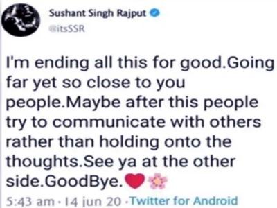 सुशांत ने अपने तीसरे और आखिरी ट्वीट में लिखा कि ‘मैं ये सब कुछ खत्म कर रहा हूं एक अच्छे अंत के लिए, दूर जा रहा हूं लेकिन तुम लोगों के पास रहने के लिए, हो सकता है इसके बाद लोग एक दूसरे से बातें करना शुरू कर दें, अपने विचारों को अपने अंदर रखना बंद कर दें, फिर मिलेंगे दुनिया की दूसरी तरफ, गुड बाय।