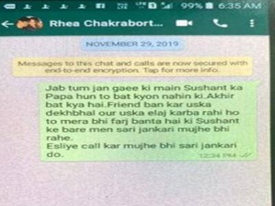 दिवंगत अभिनेता सुशांत सिंह राजपूत के पिता केके सिंह रिया चक्रवर्ती के खिलाफ एफआईआर दर्ज कर चुके हैं। जिस आधार पर अब मामले की जांच भी की जा रही है। इस बीच सुशांत सिंह राजपूत के पिता और रिया चक्रवर्ती के बीच व्हाट्सएप मैसेज का स्क्रीनशॉट भी सोशल मीडिया पर तेजी से वायरल हो रहा है। इसमें सुशांत के पिता अपने बेटे को लेकर रिया के सामने अपनी चिंता व्यक्त कर रहे हैं।