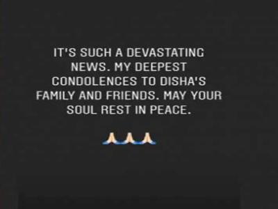 अब इस पर सुशांत सिंह राजपूत ने भी अफसोस जाहिर किया है। सुशांत सिंह राजपूत और दिशा सालियान काफी समय तक एक-दूसरे के साथ काम किया था। दोनों के बीच बॉन्डिंग भी काफी अच्छी थी। दिशा सालियान की मौत पर सुशांत सिंह राजपूत ने लिखा, "ये बहुत दुखद खबर है। दिशा के परिवार और दोस्तों को मेरी सांत्वना। ईश्वर तुम्हारी आत्मा को शांति दे।"
