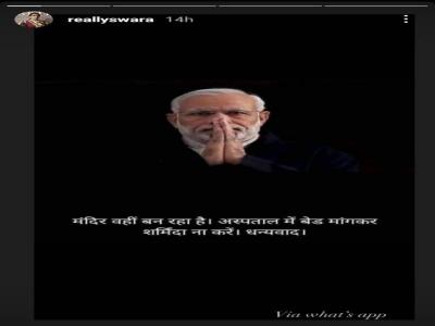 स्वरा ने अपनी इंस्टाग्राम स्टोरी पर प्रधानमंत्री मोदी की हाथ जोड़े तस्वीर लगाई और तंज करते हुए लिखा, 'मंदिर बन रहा है, अब बेड मांगकर शर्मिंदा न करें । धन्यवाद . ' हाल ही में स्वरा भास्कर की मां ईरा भास्कर भी कोरना पॉजिटिव हो गई है । उन्होंने ट्वीट करके जानकारी दी कि मां और मेरी कुक कोरोना पॉजिटिव हो गई है इसलिए मैं और मेरा पूरा परिवार होम क्वारंटाइन में है ।