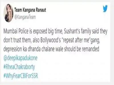 दीपिका पादुकोण अक्सर डिप्रेशन संबंधी अपने अनुभवों पर बात करती रहती हैं। इस बात को लेकर कंगना रनौत की टीम ने उन पर तंज कसा है। यही नहीं, मुंबई पुलिस पर भी सवाल उठाए गए हैं। कंगना की टीम ने लिखा, ''मुंबई पुलिस एक्सपोज हो गई है। सुशांत के परिवार ने कहा है कि वह उनपर भरोसा नहीं करते हैं। इसके साथ ही बॉलीवुड गैंग में डिप्रेशन का धंधा चलाने वाले को भी रिमांड पर लिया जाना चाहिए।''