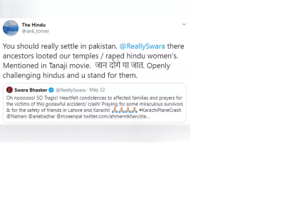 पाकिस्तान में विमान हादसा होने के बाद स्वरा भास्कर ने ट्वीट करते हुए लिखा था, 'बेहद दुखद, पीड़ित परिवारों को लिए संवेदना और इस हादसे में पीड़ितों के लिए प्रार्थना। इस हादसे में चमत्कारी तौर बचे लोगों के लिए प्रार्थना करती हूं और कराची और लाहौर में अपने दोस्तों की सुरक्षा के लिए प्रार्थना करती हूं।