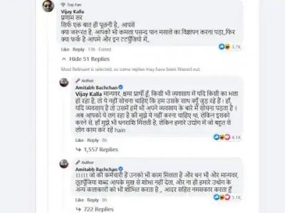 हाल ही में फेसबुक पर अमिताभ बच्चन ने एक पोस्ट में लिखा था, 'एक घड़ी खरीदकर हाथ में क्या बाँध ली, वक्त पीछे ही पड़ गया मेरे।' इस पर एक सोशल मीडिया यूजर ने लिखा, 'प्रणाम सर, सिर्फ एक बात ही पूछनी है आपसे... क्या जरूरत है कि आपको भी कमला पसन्द पान मसाले का विज्ञापन करना पड़ा, फिर क्या फर्क है आप में और इन टटपुंजियो में....।'