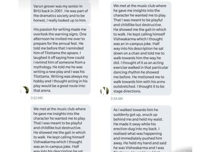 महिला का कहना है कि वरुण ने उसकी पीठ पर अपनी सिर लगाने की कोशिश की थी जिसके बाद उसने उन्हें पीछे धकेल दिया था। लेखक हरिधि कौर ने अपने ट्विटर हैंडल पर अपनी आप बीती का एक स्क्रीन शार्ट साझा करते हुए वरुण पर शोषण का आरोप लगाया है। इससे साफ हो रहा है कि वरुण ने उसके साथ यौन शोषण किया है।महिला ने बताया है कि ये घटना 2001 की है जब वरुण बनारस हिन्दू युनिवर्सिटी में पढ़ाई कर रहे थे, उसी वक्त वो कॉलेज के लिए कई प्ले भी लिखा करते थे। महिला का कहना है कि वरुण ने उनके साथ प्ले की तैयारी के दौरान बदतमीजी और उनका शोषण किया।
