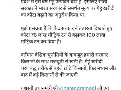 मध्यप्रदेश के मुख्यमंत्री डॉ. मोहन यादव किसान कल्याण के लिए कितने प्रतिबद्ध हैं, इसका अंदाजा इस फैसले से लगाया जा सकता है। उनके अनुरोध पर केंद्र सरकार ने प्रदेश का गेहूं खरीदी कोटा बढ़ा दिया है। भारत सरकार ने समर्थन मूल्य पर गेहूं की खरीदी के लिए 78 लाख मीट्रिक टन का कोटा निर्धारित किया था, जिसे अब बढ़ाकर 100 लाख मीट्रिक टन कर दिया गया है। यह निर्णय प्रधानमंत्री नरेंद्र मोदी की किसान हितैषी भावना को दर्शाता है।