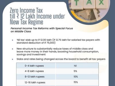 अब चार लाख रुपये सालाना आय पर कोई कर नहीं लगेगा। चार से आठ लाख रुपये पर पांच प्रतिशत, आठ से 12 लाख रुपये पर 10 प्रतिशत, 12 लाख से 16 लाख रुपये पर 15 प्रतिशत, 16 से 20 लाख रुपये पर 20 प्रतिशत, 20 लाख रुपये से 24 लाख रुपये पर 25 प्रतिशत तथा 24 लाख रुपये से ऊपर की सालाना आय पर 30 प्रतिशत कर लगेगा। प्रत्यक्ष कर छूट से सरकारी खजाने पर एक लाख करोड़ रुपये का बोझ आएगा।