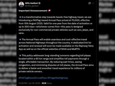 नई दिल्लीः सड़क परिवहन एवं राजमार्ग मंत्री नितिन गडकरी ने बुधवार को एक एक्स पोस्ट में कहा कि सरकार 3,000 रुपये की कीमत वाला फास्टैग आधारित वार्षिक पास पेश कर रही है। उन्होंने कहा कि 15 अगस्त से जारी होने वाला यह पास जो केवल गैर-वाणिज्यिक निजी वाहनों के लिए उपलब्ध है। वार्षिक पास पूरे देश में राष्ट्रीय राजमार्गों पर निर्बाध और लागत प्रभावी यात्रा को सक्षम करेगा। लिंक जल्द ही राजमार्ग यात्रा ऐप के साथ-साथ NHAI (भारतीय राष्ट्रीय राजमार्ग संघ) और MoRTH (सड़क परिवहन और राजमार्ग मंत्रालय) की आधिकारिक वेबसाइटों पर उपलब्ध कराया जाएगा।