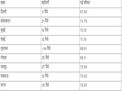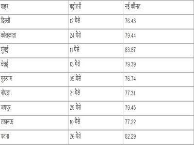 गुरुवार को महानगरों में पेट्रोल की कीमतें 11 से 15 पैसे की दर से बढ़ी हैं। वहीं, दिल्ली में पेट्रोल 15 पैसे बढ़कर 76.43 के स्तर पर मिल रहा है। कोलकाता में यह 79.33 रुपये और मुंबई में 83.87 रुपये का प्रति लीटर मिल रहा है। जबकि चेन्नई की बात करें तो यहां आपको 79.39 प्रति लीटर चुकाने पड़ रहे हैं।