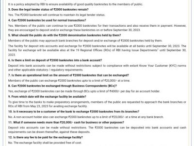 नोट को बैंकों में 23 मई से जमा या बदला जा सकता है। आरबीआई ने शाम को जारी एक बयान में कहा कि अभी चलन में मौजूद 2,000 रुपये के नोट 30 सितंबर तक वैध मुद्रा बने रहेंगे। इसके साथ ही आरबीआई ने बैंकों से 2,000 रुपये का नोट देने पर तत्काल प्रभाव से रोक लगाने को कहा है। उसने बैंकों से 30 सितंबर तक ये नोट जमा करने एवं बदलने की सुविधा देने को कहा है।