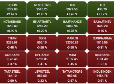 BSE सेंसेक्स पर 30 में से 10 शेयर हरे निशान में थे। हिंदुस्तान यूनिलीवर, टेक महिंद्रा, नेस्ले इंडिया, टीसीएस और आईटीसी शीर्ष लाभ में रहे, जबकि पावर ग्रिड कॉर्प, इंडसइंड बैंक, टाटा मोटर्स, जेएसडब्ल्यू स्टील और टाटा स्टील शीर्ष पर रहे।