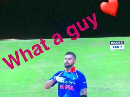 विराट कोहली की इस शानदार पारी की हर तरफ तारीफ हो रही है लेकिन एक तारीफ की चर्चा हर तरफ हो रही है। ये तारीफ की है कोहली की पत्नी और प्रसिद्ध ऐक्ट्रेस अनुष्क शर्मा ने। अनुष्का ने कोहली के शानदार शतक के बाद इंस्टाग्राम पर उनकी तारीफ करते हुए कई तस्वीरें शेयर कीं और लिखा, 'वॉट अ गाइ' ('क्या लड़का है') (पढ़ें: विराट कोहली ने लगाई रिकॉर्डों की झड़ी, सचिन-गांगुली की बराबरी करते हुए 9 देशों में जड़ा शतक)