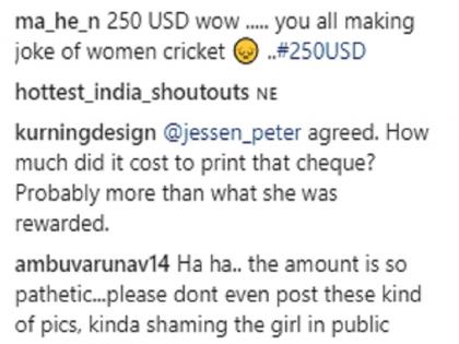 भारत के लिए ये जीत वाकई दमदार रही लेकिन मिताली को 'प्लेयर ऑफ द मैच' का अवॉर्ड दिए जाने के बाद सोशल मीडिया पर एक नई चर्चा छिड़ गई है। दरअसल, मैच के बाद भारतीय क्रिकेट टीम के आधिकारिक इंस्टाग्राम हैंडल ने मिताली की फोटो शेयर की। इसमें मिताली 'प्लेयर ऑफ द मैच' के लिए मिले डमी चेक को लेकर खड़ी है। लेकिन विवाद ईनामी राशि को लेकर छिड़ा है।
