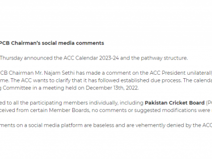 एसीसी ने आगे कहा, "कैलेंडर को तब 22 दिसंबर 2022 को एक ईमेल के माध्यम से पाकिस्तान क्रिकेट बोर्ड सहित सभी भाग लेने वाले सदस्यों को व्यक्तिगत रूप से सूचित किया गया था। जबकि कुछ सदस्य बोर्डों से प्रतिक्रियाएँ प्राप्त हुई थीं, पीसीबी से कोई टिप्पणी या सुझावित संशोधन प्राप्त नहीं हुए थे। इसके मद्देनजर सोशल मीडिया प्लेटफॉर्म पर मिस्टर सेठी की टिप्पणियां निराधार हैं और एसीसी द्वारा इसका जोरदार खंडन किया जाता है।"