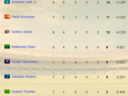 वे अब नॉकआउट चरण के लिए क्वालीफाई कर लिया है। नए प्रसारण अधिकारों के अनुसार लीग में प्रत्येक फ्रेंचाइजी अब प्रतिवर्ष 10 मैच खेलेगी। उसने पुष्टि की कि इस सत्र में लीग चरण में 56 की बजाय 40 मैच खेले जाएंगे। बीबीएल के प्लेऑफ के कार्यक्रम में फेरबदल किया गया है। इस तरह से इस टूर्नामेंट में अब कुल 44 मैचों का आयोजन होगा।