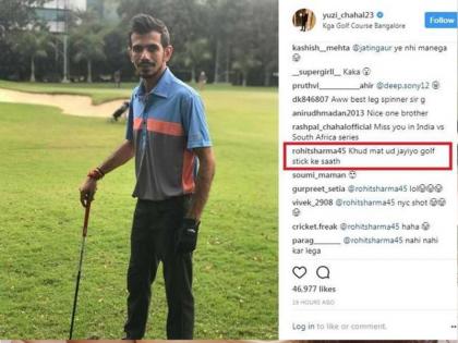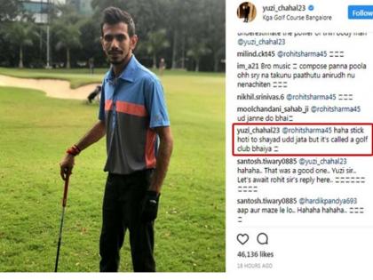 रोहित शर्मा ने चहल की फोटो पर कमेंट किया 'खुद मत उड़ जइयो गोल्फ स्टिक के साथ।' रोहित शर्मा के इस ट्वीट का चहल ने बड़ी ही समझदारी से जवाब दिया और लिखा 'स्टिक होती तो शायद उड़ जाता लेकिन इसे गोल्फ क्लब कहते हैं भैय्या'।