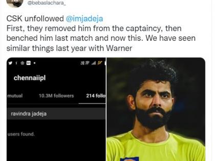 शख्स ने लिखा- धोनी ने जडेजा को सबसे खराब सीजन के लिए बलि का बकरा बनाया, फिर उन्हें सिर्फ 8 मैचों में कप्तान से बर्खास्त कर दिया, फिर धोनी ने उनकी कप्तानी की आलोचना की, फिर CSK ने उन्हें अनफॉलो कर दिया और अब आईपीएल के सर्वश्रेष्ठ खिलाड़ी से बर्खास्त कर उनका अपमान किया गया। एक अन्य यूजर ने लिखा, "काफी समय से कुछ पक रहा था। यही उनके कप्तानी छोड़ने का कारण हो सकता है। क्योंकि जडेजा अपने स्वाभाविक रूप में नहीं थे। और फिर उनकी चोट की खबर आई ... एक रहस्य लग रहा है।